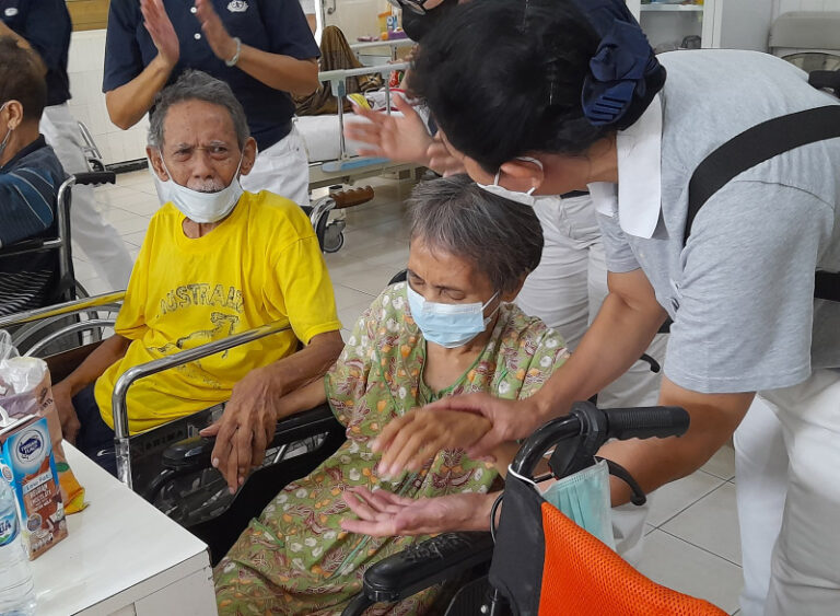 Acara ini dimulai pada pukul 8.30 WIB.  Relawan bersiap dengan tulus hati menyediakan tanda kasih berupa Angpau sebagai tradisi mulia dalam berbagi dan oleh-oleh makanan lezat untuk disantap bersama oma opa. Dengan protokol kesehatan yang ketat yaitu masker dan hand sanitizer relawan mulai memasuki ruangan.  Sesungguhnya relawan akan menjaga jarak ketat, namun begitu memasuki ruangan beberapa oma langsung mengulurkan tangan, meraih, menggenggam dengan erat dan sangat rindu ingin dikasihi, membuat hati para relawan meleleh trenyuh, maka genggaman tangan pun disambut erat dengan meminta izin pada perawat.