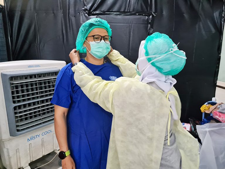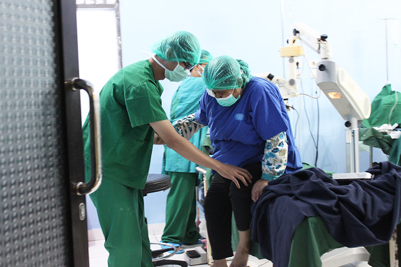 “Jadi Pak Askari ini tekanan (darah) sudah bagus, trus masih ada bengkak bagian depannya (mata). Lensa terpasang dengan baik, enggak ada pendarahan, enggak ada infeksi. Jadi santai. Tapi perawatan harus baik, maksudnya ditetes, minum obat, jadi tenang-tenang ya Pak..,” tutur dr. Kristian Goenawan, Sp.M.