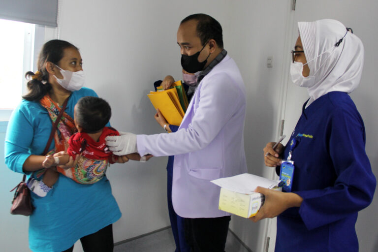 “Si Dedek nggak mau diajak duduk, Kak. Langsung rewel, maunya digendong berdiri terus,” kata si ibu yang memperkenalkan namanya, Yuliani (35). Capek memang, tapi untuk kesembuhan anaknya, Yuli rela.