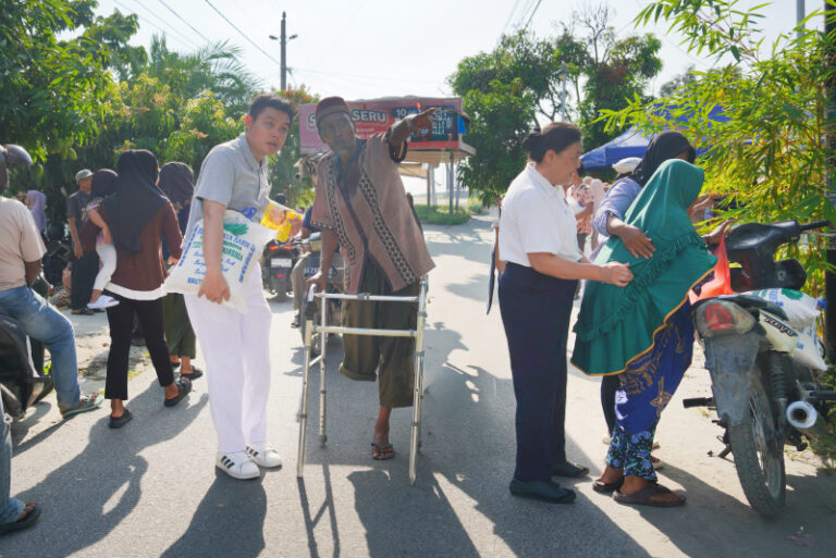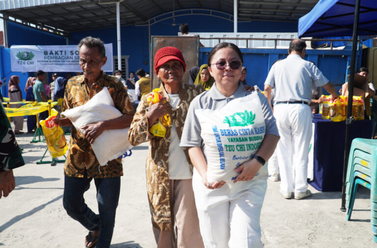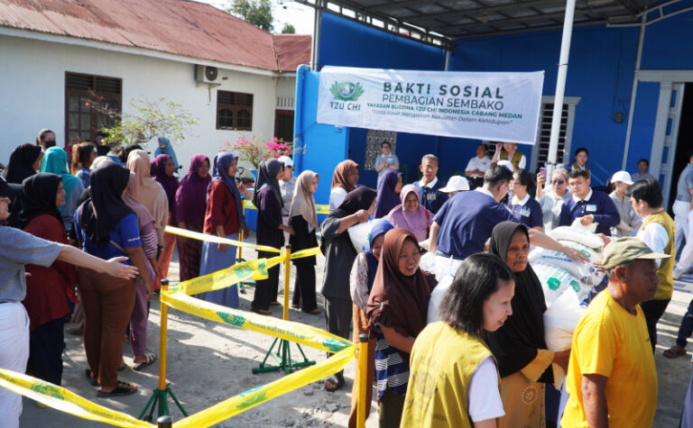 Minggu, 12 April 2026, hari masih pagi ketika 81 relawan Tzu Chi Medan komunits Hu Ai Mandala berkumpul di pelataran depan Wisma Kurnia di Jl. Tanom, Desa Tumpatan Nibung, Kecamatan Batang Kuis, Kabupaten Deli Serdang. Mereka tampak sibuk melakukan persiapan untuk kegiatan bakti sosial pembagian sembako bagi warga prasejahtera yang diadakan pada hari itu. Tenda didirikan, spanduk dan bendera Tzu Chi dipasang, alur keluar masuk dipersiapkan, beras 10 kg dan minyak goreng 2 liter satu per satu ditata rapi di atas meja yang telah disiapkan. Setelah semua persiapan selesai, para relawan siap memulai kegiatan.