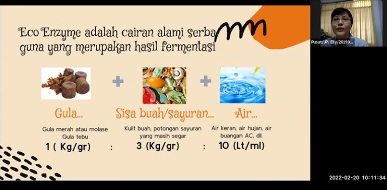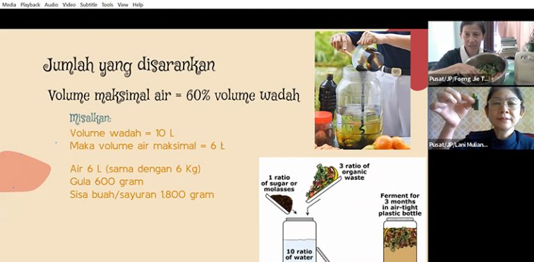 Relawan yang berhasil membuat eco enzyme ini adalah Foeng Jie Tju, dan Lani Muliana yang sudah menyiapkan tiga bahan eco enzyme yang ditampilkan langsung kepada para peserta.