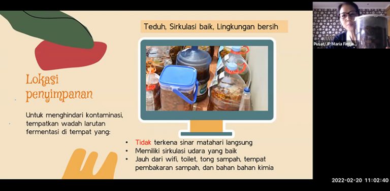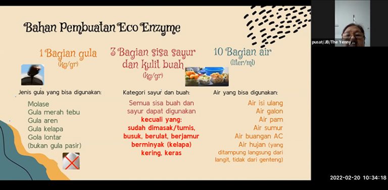 The Yenny, menyarankan peserta untuk tetap memperhatikan tujuan utama dari Eco Enzyme menjadi bagian dari ramah lingkungan, Eco Lifestyle. Oleh karena itu,, Dia menyarankan untuk memakai wadah yang sudah tersedia di rumah, atau yang sudah tidak terpakai bukan dari hasil beli baru.