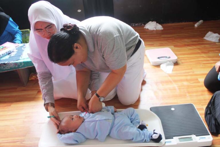 ”Sini sayang kita timbang dulu ya, beratnya berapa ini anak ganteng. Sekarang lingkar kepalanya ya, aduhhh pintarnya gak nangis,” celetuk Elly Damanik sembari mengukur lingkar kepala salah seorang anak balita.