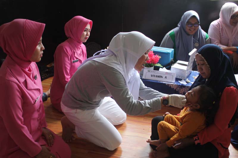 Di sisi lain terlihat beberapa anak-anak ada yang menangis saat akan diberikan vitamin A. Agustina Melisa dengan penuh kesabaran membantu memberikan vitamin A kepada anak anak tersebut. ”Uhhh sayang minum ini dulu ya, biar matanya sehat, badan sehat, anak pintar,” ujar Agustina Melisa saat memberikan vitamin A yang dibantu juga oleh ibu-ibu Bhayangkari.