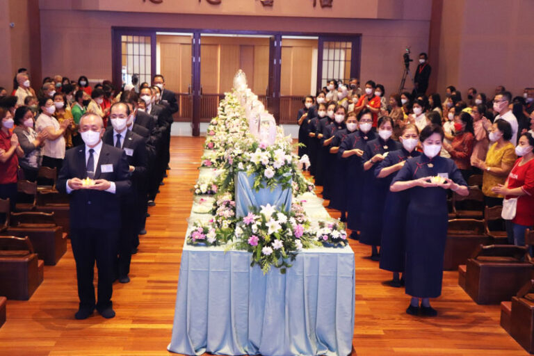 Pada prosesi Waisak ini, para peserta dan tamu undangan dengan ketulusan hati berjalan beriringan menuju altar Buddha yang dihiasi bunga wangi. Di sini para peserta menjalankan prosesi pemandian rupang Buddha dengan membungkukkan badan dan menyentuh air wangi. Hal ini bermakna dengan memandikan rupang Buddha sama artinya dengan menyucikan batin, merefleksikan diri, dan melenyapkan kegelapan batin.