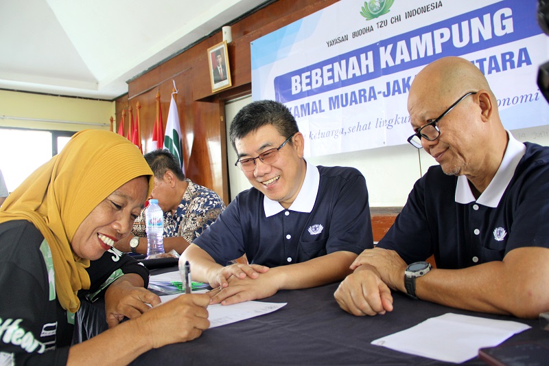 Relawan Tzu Chi didampingi oleh Lurah Kamal Muara (kedua dari kiri) dan Ketua RW 001 Kamal Muara (kiri) melakukan Penandatanganan Surat Kesepakan Bersama kepada 8 Warga penerima manfaat untuk Program Bebenah Kampung Tzu Chi di Kamal Muara Bersama Tahap 5.