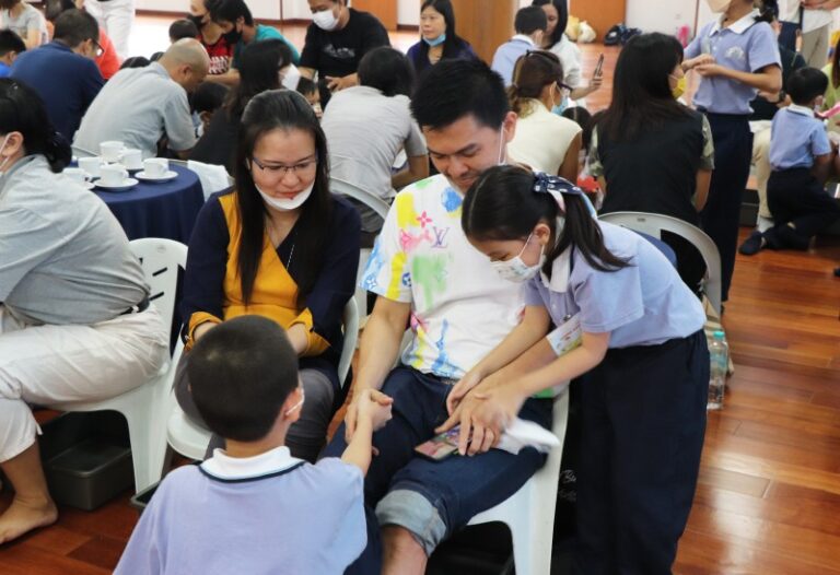 Momen anak-anak membasuh kaki orang tua mereka masing-masing, seketika suasana menjadi haru. Sebanyak 34 anak kelas budi pekerti menyuguhkan secangkir teh hangat dan membasuh kaki kedua orang tua mereka.