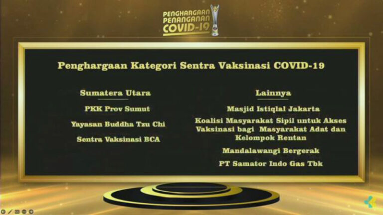 Kategori pertama, yakni Penghargaan Kategori Sentra Vaksinasi Covid-19 wilayah Sumatra Utara, dengan penghargaan diberikan kepada Yayasan Buddha Tzu Chi.