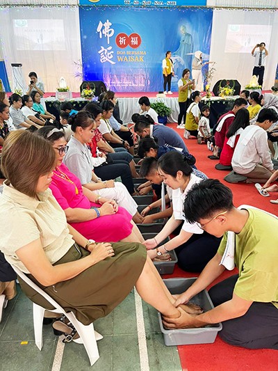 Adapun sesi basuh kaki diikuti 40 pasang peserta ibu dan anak. Para peserta anak dituntun oleh relawan untuk mengangkat baskom masing-masing berisi air yang diletakkan di bawah kaki Ibu. Rasa haru dan senang terpancar dari wajah para ibu yang melihat anak-anak bersimpuh sambil membersihkan kedua kaki. Ditambah dengan alunan lagu “Zhi Sang Ce You Ma Ma Haw” yang dibawakan oleh Sandy, relawan Tzu Chi dengan lembut dan sendu membuat air mata tak terbendung lagi dari para ibu, anak, dan relawan lain nya.