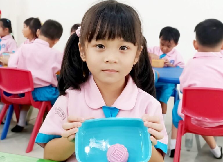 Seorang murid memperlihatkan kue bulan hasil buatannya. semangat untuk membuat kue bulan.