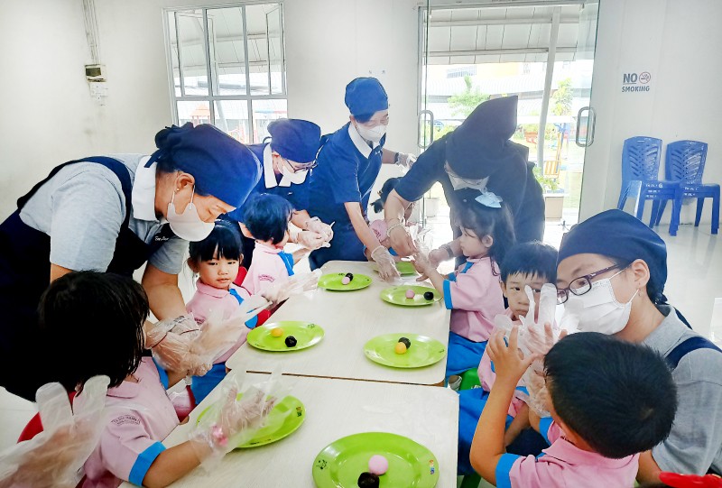 Para relawan dan guru mendampingi dan membimbing ratusan siswa membuat kue bulannya masing-masing.