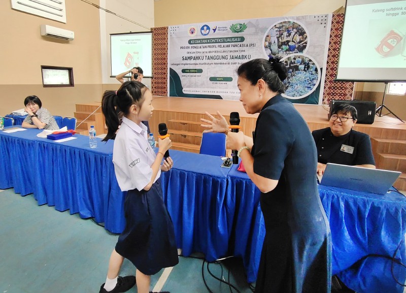 Seorang Siswi SMP Sutomp 2 dengan antusias menjawab pertanyaan dari relawan Tzu Chi seputar pelestarian lingkungan pada sesi kuis.