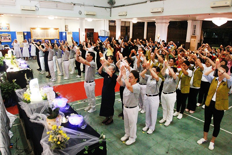 Para relawan dan tamu undangan mengangkat kedua tangan memegang pelita memberikan penghormatan tertinggi kepada Buddha.