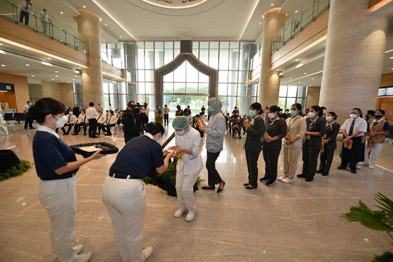 Suasana prosesi penuangan celengan bambu di lobi utama Tzu Chi Hospital yang diikuti oleh tim medis, staf, dan relawan pemerhati Tzu Chi Hospital.