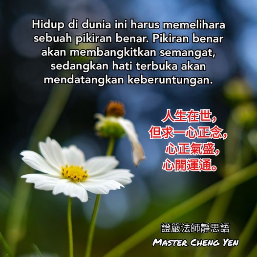Hidup di dunia ini harus memelihara sebuah pikiran benar. Pikiran benar akan membangkitkan semangat, sedangkan hati terbuka akan mendatangkan keberuntungan.