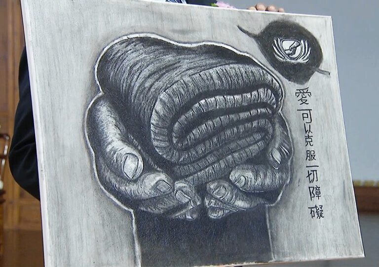 Sungguh terharu melihat lukisan selimut yang dipegang dengan kedua tangan ini. Demikianlah cinta kasih tidak memandang batasan negara. Sepasang tangan ini mengingatkan saya akan tangan-tangan Bodhisattva pelestarian lingkungan. Kalian semua seharusnya masih ingat bahwa dalam salah satu ceramah saya 30 tahun lebih yang lalu, berhubung orang-orang terus bertepuk tangan ketika saya sedang berbicara, saya mengatakan kepada semua orang, “Gunakanlah sepasang tangan yang bertepuk tangan untuk melakukan pelestarian lingkungan.” Itulah awal dimulainya pelestarian lingkungan.