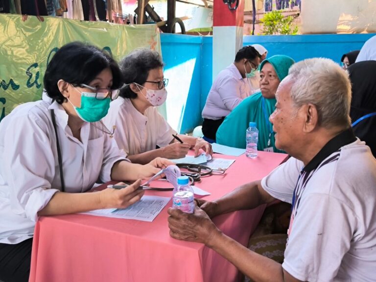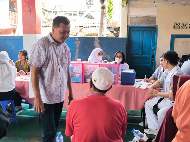 Tim medis TIMA dengan penuh perhatian memeriksa kondisi kesehatan para lansia dalam kegiatan Baksos Degeneratif di RW 012 Penjaringan, Jakarta Utara.