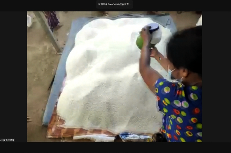 Lihatlah, butir demi butir beras terkumpul menjadi banyak. Hanya dengan menyisihkan segenggam beras, mereka dapat membantu hampir 4 ribu keluarga. Mereka telah menciptakan pahala yang tak terhingga. Dengan demikian, semua orang dapat mengenyangkan perut. Beginilah Tzu Chi yang selalu berusaha agar semua orang dapat memiliki makanan. Ketika kita bersumbangsih dengan cinta kasih, welas asih, sukacita, dan keseimbangan batin, semua orang dapat menapaki Jalan Bodhisatwa dan mencapai kebuddhaan. Orang-orang kurang mampu juga dapat bersumbangsih.