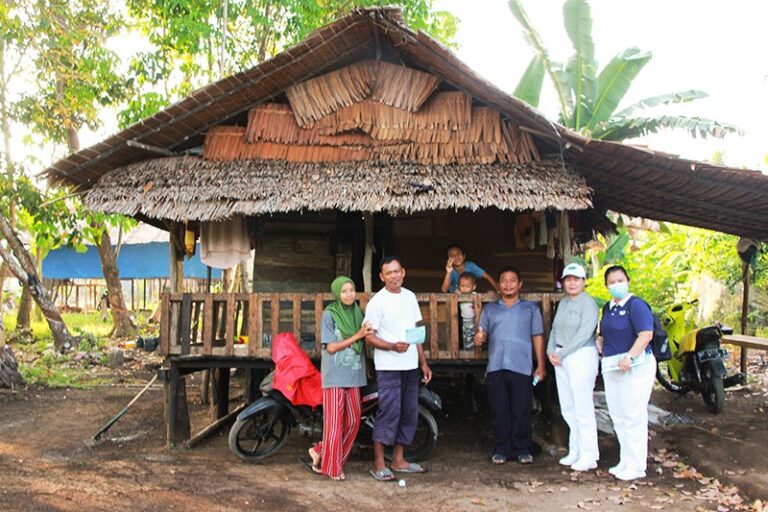Relawan dan Pak Khaidir (berpakaian baju abu celana hitam) selaku RT 03 berfoto bersama dengan warga sewaktu melakukan survei kondisi warga.
