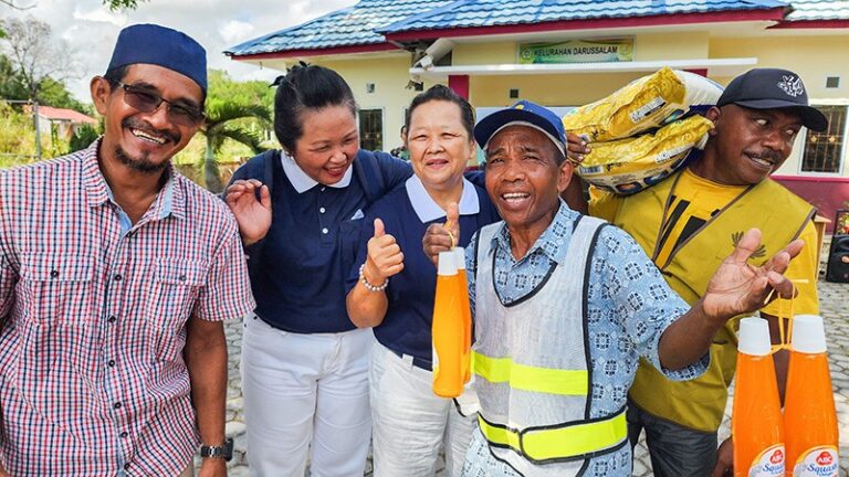 Seorang relawan membantu warga mengangkut beras sambil bertukar senyum dan tawa.