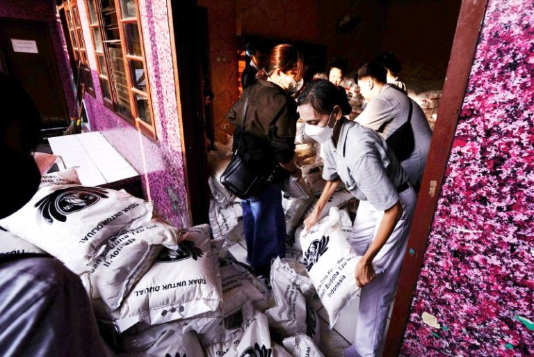 Para relawan dengan sigap dan penuh semangat mempersiapkan ribuan paket beras untuk dibagikan kepada warga yang membutuhkan.