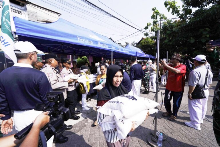 Pembagian paket beras secara simbolis dilakukan oleh Yonga Wang, Ketua Relawan Tzu Chi He Qi Barat 2, bersama jajaran tokoh masyarakat dan perwakilan tiga pilar sebagai tanda dimulainya kegiatan bakti sosial.