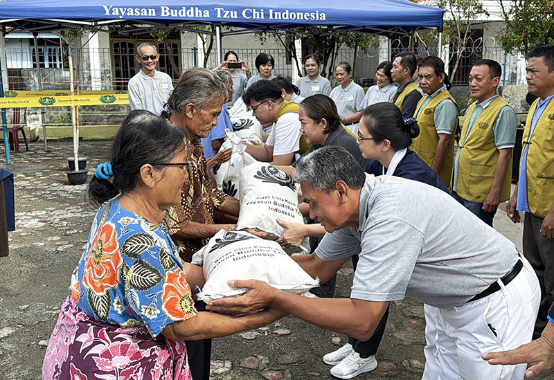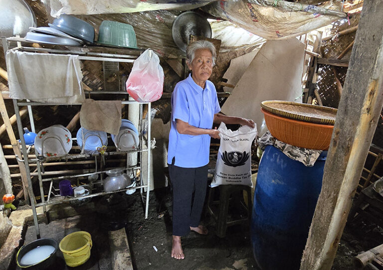 “Namo Buddhaya, banyak terima kasih, senang ya namanya kita uda dikasi,” tutur Pak Santo dengan beranjali dibarengi dengan senyuman saat mengungkapkan rasa senangnya menerima paket cinta kasih dari Yayasan Buddha Tzu Chi.