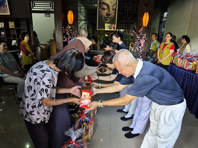 Setelah sesi gathering, relawan melaksanakan pembagian paket sembako, paket Imlek, dan angpau secara simbolis. Tidak hanya dibagikan di kantor, sebagian bantuan juga diantarkan langsung ke rumah penerima yang berhalangan hadir karena kondisi kesehatan atau kendala lainnya. Hal ini menunjukkan komitmen relawan Tzu Chi untuk memastikan cinta kasih tetap tersampaikan tanpa batas.