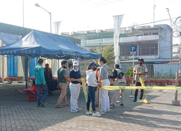 Pembagian ini berlangsung pada Minggu, 24 April 2022. Beberapa relawan Tzu Chi tengah hadir untuk mempersiapkan penyaluran paket lebaran yang segera dibagikan pukul 14.00 WIB. Ada relawan yang mempersiapkan police line agar para penerima bantuan dapat tertib dalam mengambil paket, ada juga relawan Tzu Chi bersama relawan kembang (Rompi ) menurunkan minyak goreng dan botol sirup disusun rapi sebelum dibagikan.