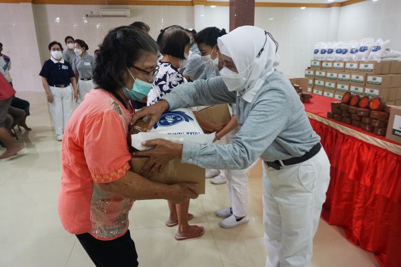 Setiap paketnya berisi 10 kg beras, 20 bungkus mi instan, 2 liter minyak goreng, 1 kg gula pasir, masker medis, serta kue keranjang.