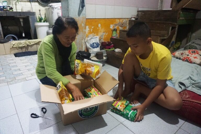 Oma Oey Kian Nio dan sang cucu gembira membukan paket sembako dari Tzu Chi.