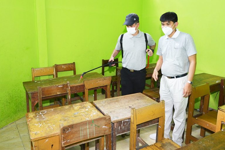 Koordinator Baksos Kesehatan Degeneratif di Kamal Muara, Thio Warsidi (kanan) mendampingi salah satu relawan untuk mensterilkan ruangan-ruangan yang dipakai untuk kegiatan baksos.
