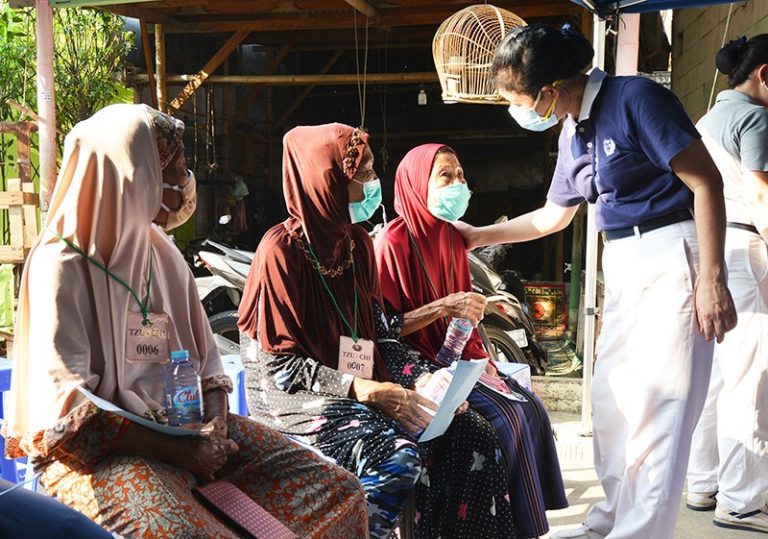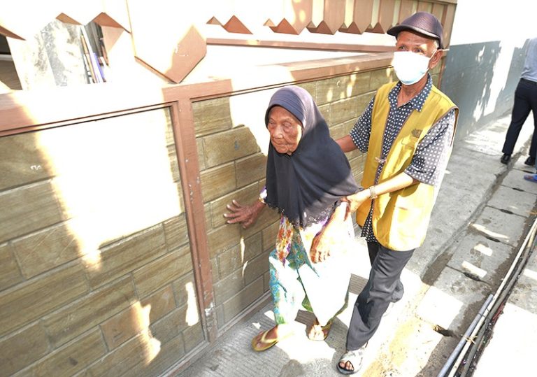 Jap Bon Kiun bersama seorang tunas relawan membantu Kariyah berjalan saat menjalani pemeriksaan kesehatan.