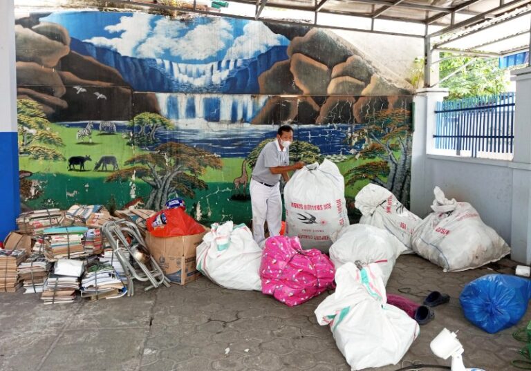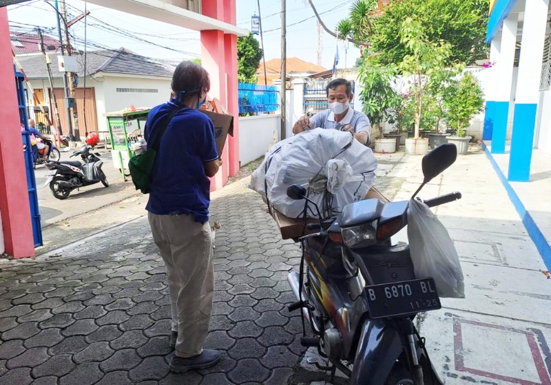 Sim Joeng Tjhen menerima barang-barang dari donatur berupa botol-botol plastik yang diantar langsung oleh donotur ke Sekolah Surya Dharma, Kebayoran Lama, Jakarta Selatan.