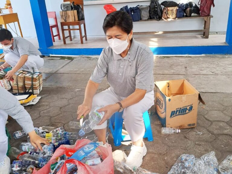 Etty, salah satu relawan yang ikut berpartisipasi menyempatkan waktu untuk melakukan memilah barang-barang sebelum melakukan kegiatan pelayanan di gerejanya. Etty dengan semangat memisahkan tutup botol dan label botol.