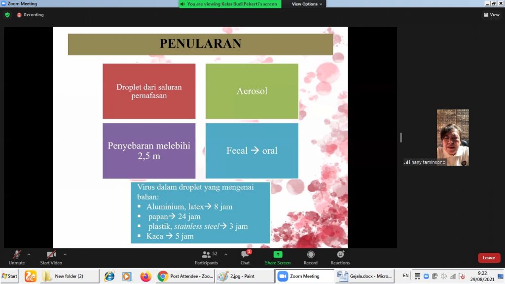 Topik Acara Parenting ini berlangsung pada Minggu 29 Agustus 2021 melalui aplikasi Zoom yang diikuti oleh peserta parenting kelas budi pekerti sebagai nara sumber dr. Nany, MKT TIMA dengan tema “Pengetahuan Tentang Covid 19”.