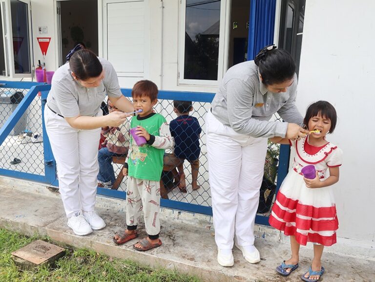 ”Kumurnya hanya boleh sekali ya, tadi kan kata pak dokter begitu. Jadi langsung banyak saja air yang masuk ke mulut dan dikumurkan sekali saja Nak.” kata Norani Yan dengan wajah penuh senyum. ” Rasanya enak kali, macam jeruk,” celetuk Naziah (4) seraya mengecap.