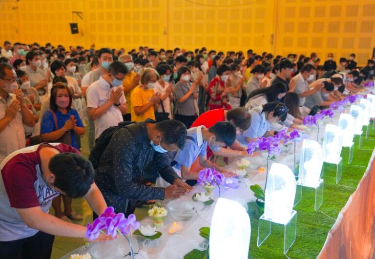 Pada akhir acar prosesi perayaan Waisak 2023 para relawan dan tamu undangan yang hadir melakukan doa bersama dengan memanjatkan tiga ikrar, pelimpahan jasa dengan melantunkan Gatha Pemandian Rupang Buddha dan penghormatan tertinggi kepada Buddha.