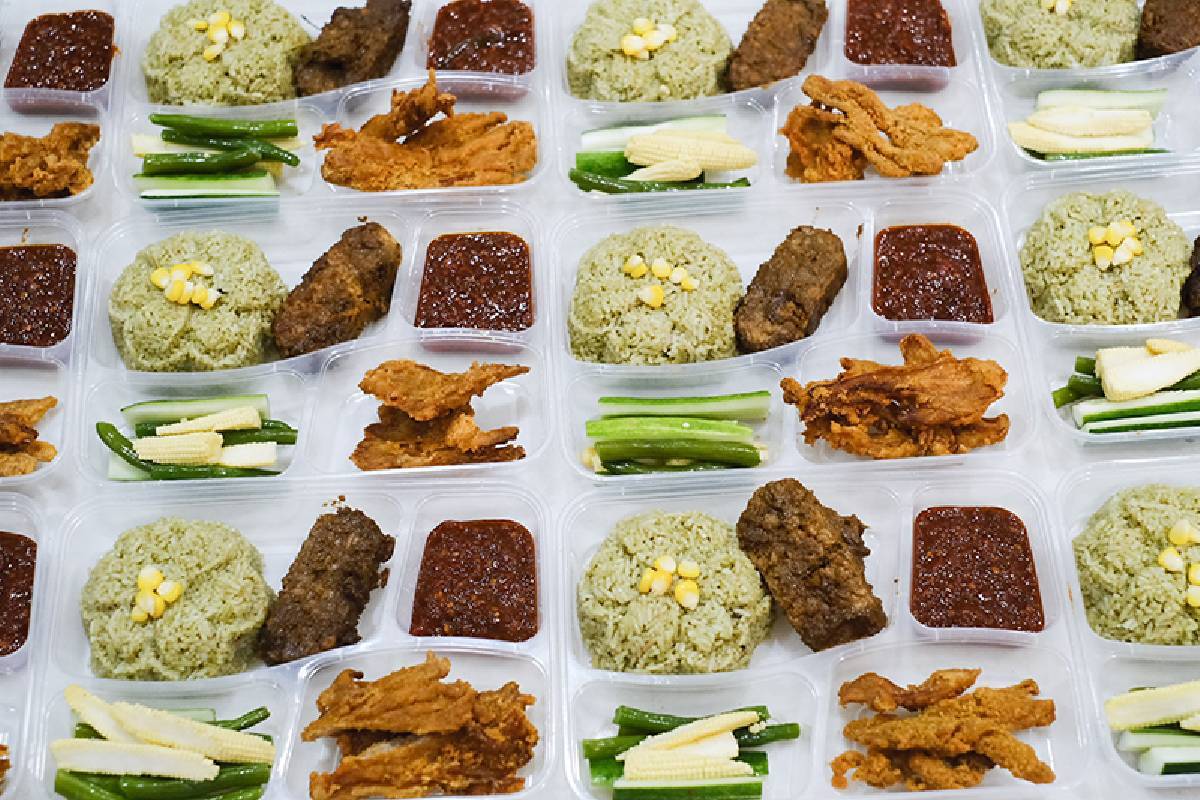 “Tetapi sudah ada beberapa menu dan kami diminta untuk memilih menu yang ditawarkan. Dari sembilan menu untuk makan malam, saya tertarik dengan nasi ayam penyet vegetarian. Yang mana bahan utamanya sudah pasti bukan ayam, tetapi sebagai pengganti ayam, saya memakai jamur tiram karena saya tidak suka pakai bahan gluten.Untuk nasinya sudah pasti nasi uduk dan supaya menarik kami masak nasi pandan dan kita cetak dengan cetakan bunga dan di tengahnya saya berikan sedikit jagung. Agar jamur bisa tetap garing dan gurih, kami pelajari di beberapa konten masak dan sangat bersyukur, bersama dengan beberapa relawan, kami bisa selesaikan menu nasi ayam sebanyak 106 paket,” terang Nuraina.