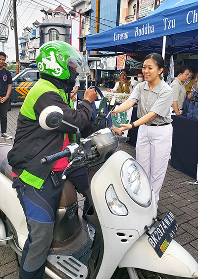 Terlihat satu persatu pejalan kaki yang lewat menghampiri relawan dan antre untuk mendapatkan paket takjil. Begitu juga pengendara sepeda motor dengan senyum ramah berhenti untuk menerima paket takjil dari relawan Tzu Chi.