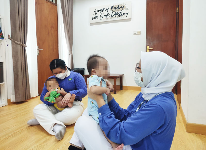 Relawan Tzu Chi tengah menggendong salah satu balita untuk diajak bermain. Di Rumah RUTH ini terdapat 16 anak yang ditelantarkan oleh orang tua mereka. Di Rumah RUTH ini para pengurus Rumah RUTH merawat dan memberikan kasih sayang kepada para bayi dan balita.