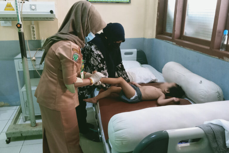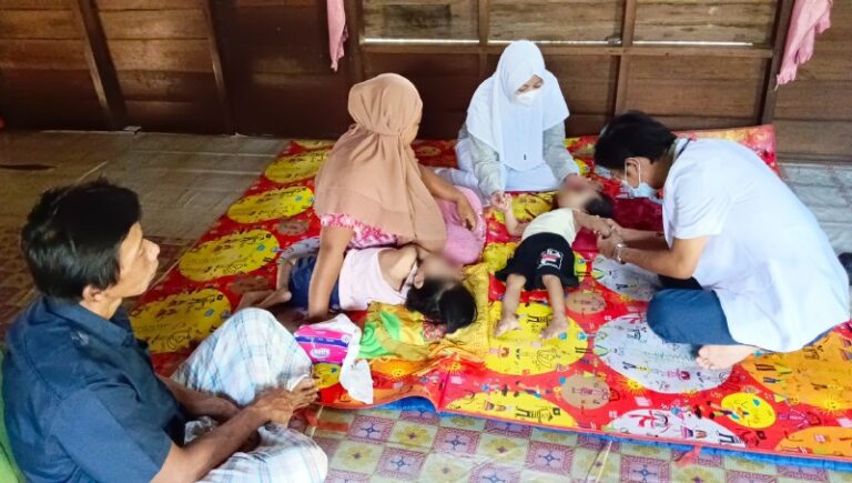 “Halo Hani, bapak periksa ya,” ucap dr. Jupanri Siregar sembari mendekati Hani. Dokter memeriksa denyut jantung dan paru-paru, dilanjutkan melihat kelopak mata, kulit, tangan serta kaki Hani. Dokter juga memeriksa kondisi badan Hani apakah sedang demam atau tidak serta menggerakkan siku tangan dan lutut kaki Hani yang terlihat mulai kaku. “Puji Tuhan kondisi badan Hani secara fisik baik dan sehat, karena itu besok Hani dapat dibawa berobat ke RSUD Kota Tembilahan. Besok akan saya dampingi juga dan untuk pemeriksaan awal kita bawa ke dokter spesialis anak,” ujar dr. Jupanri.