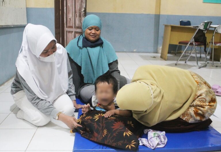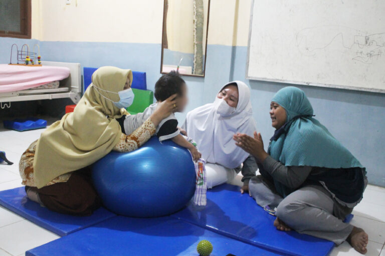 Ambar melanjutkan terapi dengan kembali menggerakkan seluruh anggota badan Hani. Menggerakan hp ke kanan kiri, atas bawah dengan film kartun untuk melihat respon gerakan mata dan Hani pun mengikuti kemana arah suara hp tersebut. Kemudian memiringkan badan Hani ke kanan selama 5 menit, mendudukkan dengan posisi duduk normal pada umumnya dan Hani pun langsung menangis merasa tidak nyaman. Relawan langsung membantu menenangkan Hani. “Mulai besok ibu harus rajin mendudukkan Hani dengan posisi seperti ini selama setengah jam setiap pagi, siang, dan sore, kemudian juga lebih banyak memiringkan posisi tubuh Hani ke kanan, kalau Hani sukanya miring ke kiri. Ibu harus rajin terapi Hani sendiri di rumah dengan gerakan yang mudah seperti ini Bu,” terang Dwi Ambarwati A.Md OT kepada Wati dan relawan sembari mencontohkan beberapa gerakan yang mudah.” Iya bu besok saya lakukan itu untuk Hani,” jawab Wati. Terapi dilanjutkan dengan posisi Hani tengkurap. Relawan membantu dengan memegang mainan berwarna cerah dan mengarahkan ke atas agar Hani dapat mengangkat lehernya lebih lama. “Ayo Hani lihat ke sini, ada mainan apa ini ya? Ayo Nak jangan nangis. Hani pasti bisa,” ujar Agustina Melisa dengan penuh semangat.